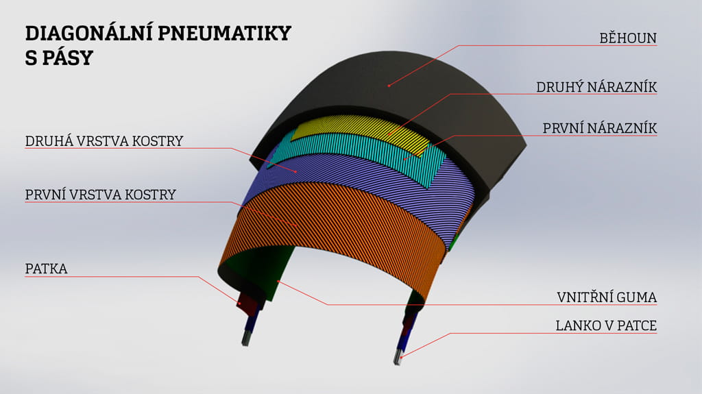Diagonální pneumatiky – s nejdelší tradicí a nejrozšířenější na trhu. Kostra diagonální pneumatiky se skládá ze dvou nebo více vrstev textilního kordu (umělé hedvábí, nylon, polyester), které se v určitých úhlech kříží. Diagonální pneumatiky jsou správnou volbou pro menší motocykly s nižší objemem, skútry a starší motocykly, jejichž šasi je přizpůsobeno diagonálním pneumatikám.